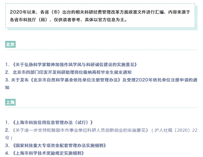 2020年以來,各?。ㄊ校┏雠_的相關(guān)科研經(jīng)費(fèi)管理改革方面政策文件進(jìn)行匯編,內(nèi)容來源于各省市科技廳(局),僅供讀者參考,具體以官方信息為主。北京1. 《關(guān)于弘揚(yáng)科學(xué)家精神加強(qiáng)作風(fēng)學(xué)風(fēng)與科研誠信...